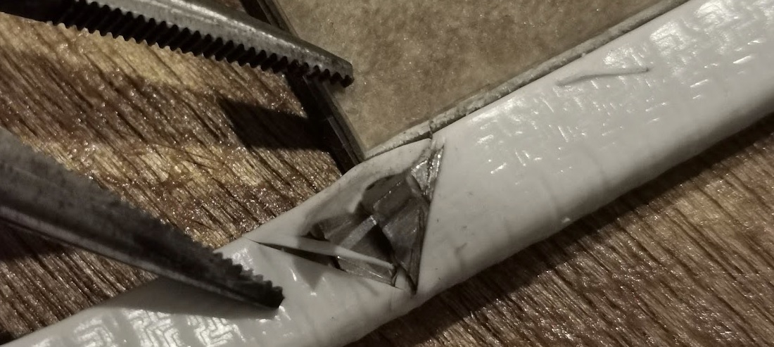 ちなみにこのV字カット作業、前述の「中に金属が入っている」というのが障害になってかなり大変でした。(中の金具をいくつか、ペンチで強引に引き抜いてなんとかV字を作ることができた)