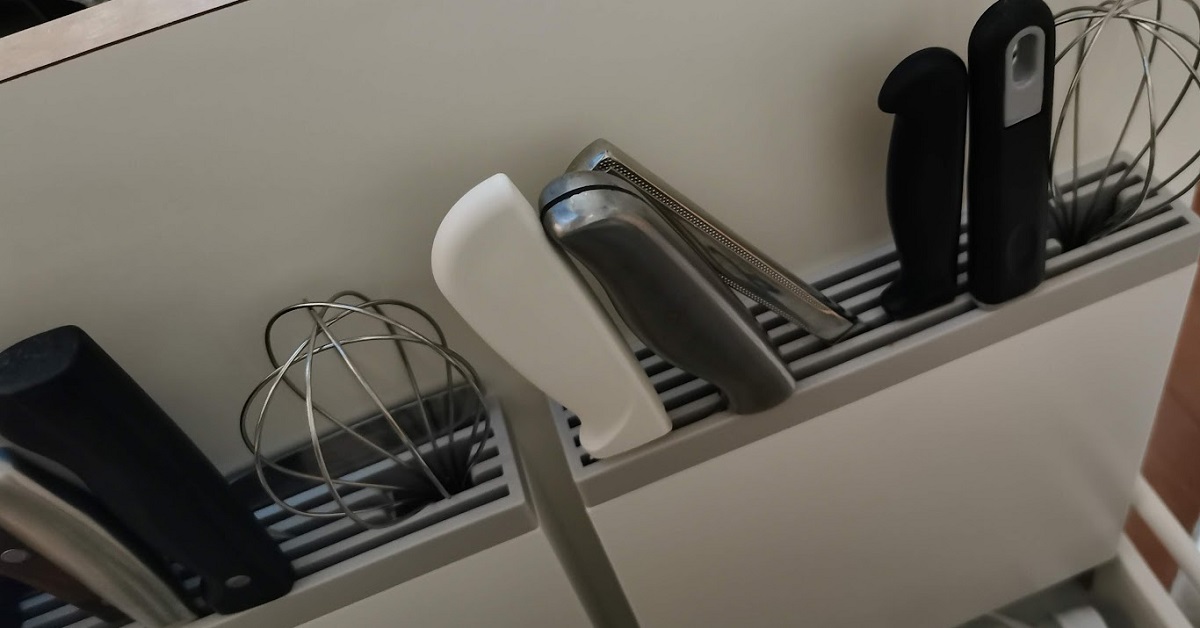 設置位置は、引き出し内部の他のパーツ(凸凹)との取り合いもあるのですが、それだけでなく、実際に収納予定の包丁の柄の高さも結構大事です。