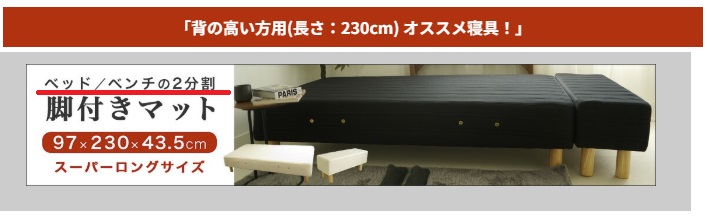 いや~確かに230cmなんだろうけど・・・これはノーマルサイズのベッドに、フットレストみたいなのを追加して230cmと称しているってだけで、、、ち~が~う~だ~ろ~、と。