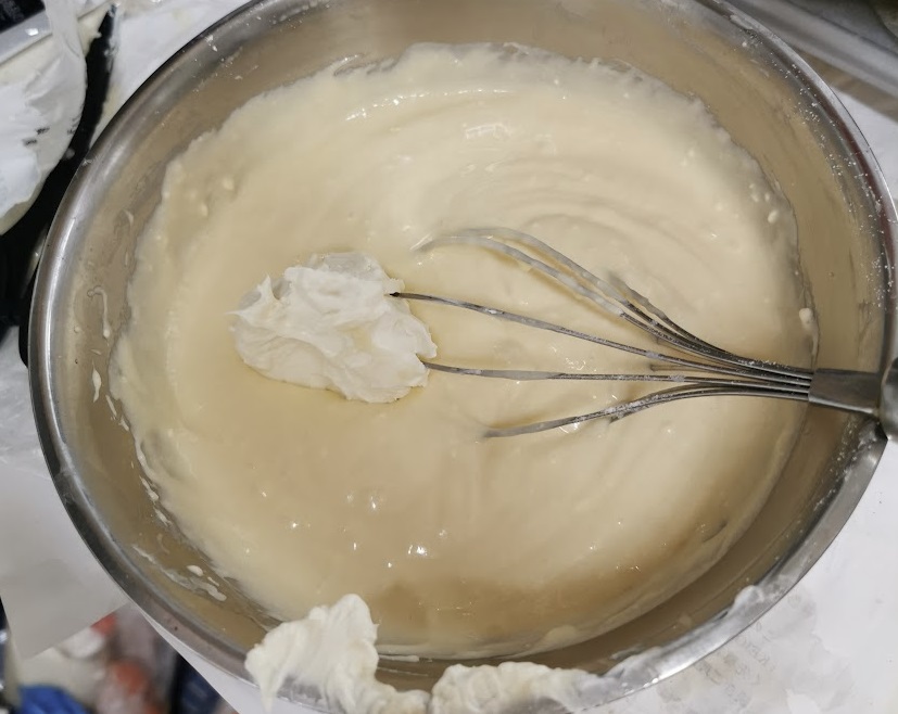 ※なお、温度が低い状態のチーズはクリームとはいえカタめで粘度も高いです。このようなホイッパーで手早く小さく切り混ぜていくのは結構チカラが必要ですた。。。